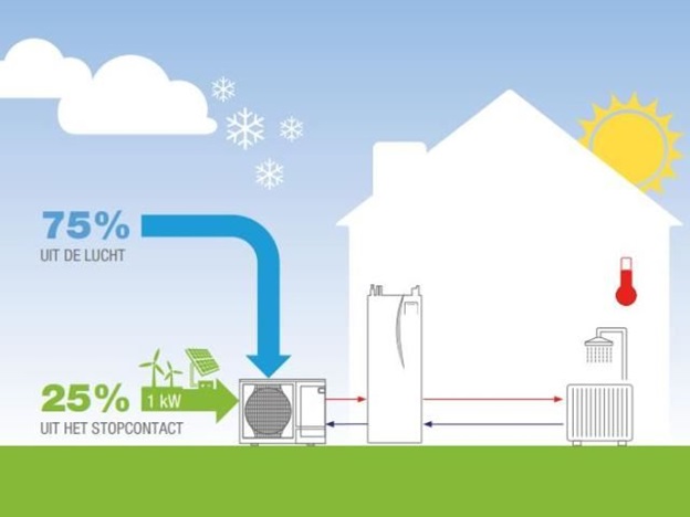 Terwijl een warmtepomp maar voor een kwart van haar verbruik elektriciteit nodig heeft. Dat volstaat om de natuurlijke warmte uit de omgeving op de gewenste temperatuur te brengen.Stukken beter dus op vlak van CO2-productie. Er bestaan ook combinatiesystemen die niet alleen de woning, maar ook sanitair water kunnen verwarmen.
